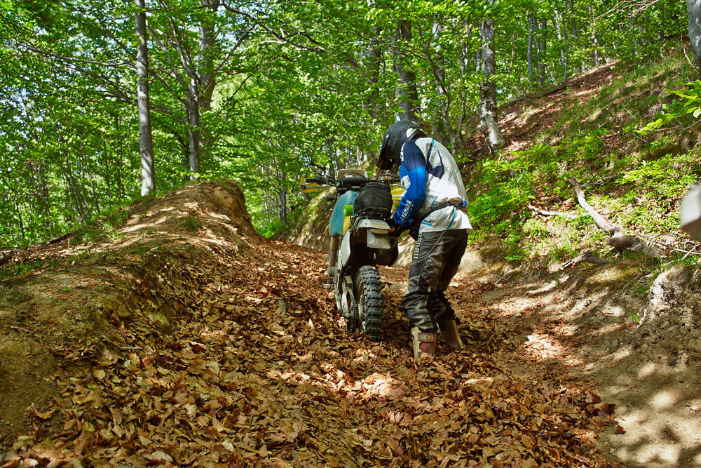 Deshalb beschließen wir, es diesmal ein wenig ruhiger angehen zu lassen. Wir fahren diesmal hinten aus Brebu Nou raus und den Hang hinauf. Ein Hohlweg mit viel Laub und gewachsenen Fels bringt Bernd kurz ins Straucheln, die DR steht aber gleich wieder auf den Rädern und wir können unsere Fahrt fortsetzen.
