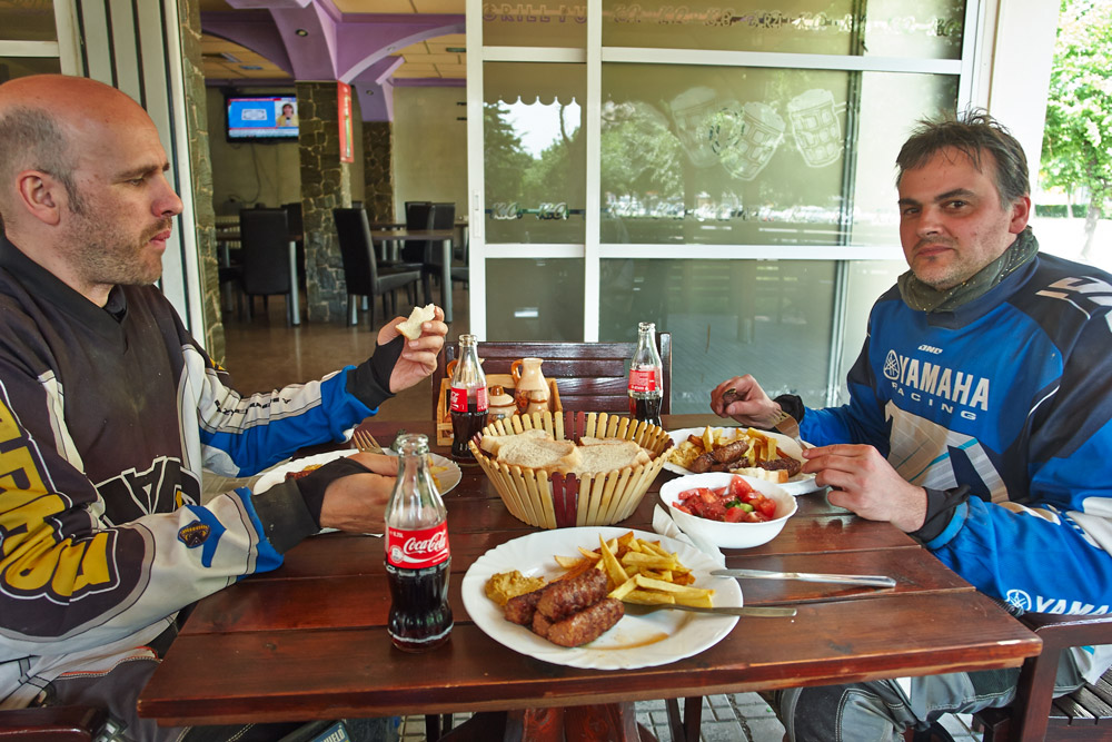 Als ich draußen den Helm und die Handschuhe anziehe kommt er nochmal raus und sagt, ich solle es bei der Konkurrenz versuchen. Er beschreibt mir den Weg, die haben aber zu. Dafür entdecke ich auf dem Weg dahin ein Schild vor einem Lokal ‚Mitch‘. Ich mus an die Freunde aus Biled denken, wo wir die schon gegessen haben.