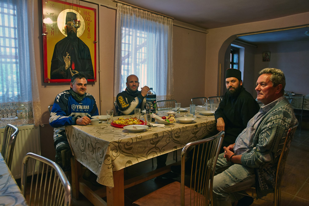 Wir kommen ins Gespräch, ich erfahre, dass eine Schwester in Karlsruhe lebt und sein Sohn einer der 6 Mönche des Klosters ist. Den holt er dann auch gleich herbei. Wir bekommen das Gelände gezeigt und erklärt und werden auch in die Kirche gebeten. Aufmunternd winkt mir der Mönch zu, dass ich ruhig fotografieren soll, während vorne in der Ecke zwei Mönche eine Art Messe zelebrieren. Während einer der beiden in Rumänisch singt, bekreuzigt sich der andere ständig. Dann wird das Podest, auf dem das Buch steht um 90 Grad gedreht und die Rollen getauscht.