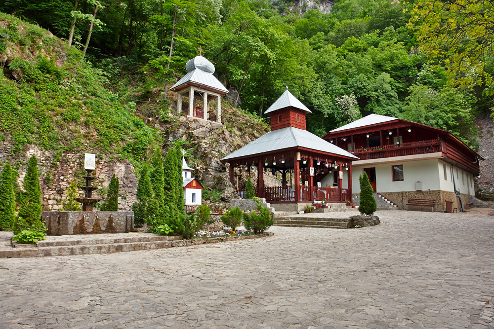 Wir finden das Werk nicht und weil ich schon mal gelesen habe, dass es abgerissen werden soll, geben wir auch auf, danach zu suchen. Ich entschädige uns mit einem ordentlichen Stück Offroad-Strecke, der uns halb bis Oravița bringt. Hier befindet sich das älteste Theater in Rumänien, welches wir uns zumindest von außen ansehen. Dann zieht es mich weiter zu einem Kloster mitten im Wald: Călugăra. Mit der Chaos-Navigation (das Navi zeigt die Luftlinie zum Ziel) fahren wir darauf zu, müssen aber nach vielen Kilometern Feldweg feststellen, dass wir auf der falschen Seite des Berges sind. Also die ganze Strecke zurück. Auf den zweiten Versuch klappt es sofort und wir erklimmen den Berg zum Kloster über ein winziges Sträßchen mit abenteuerlichen Serpentinen.