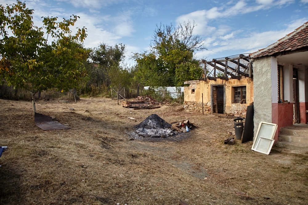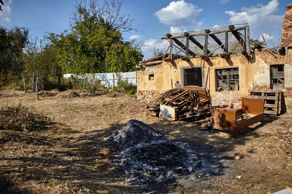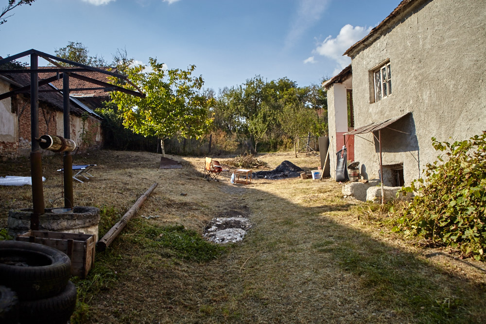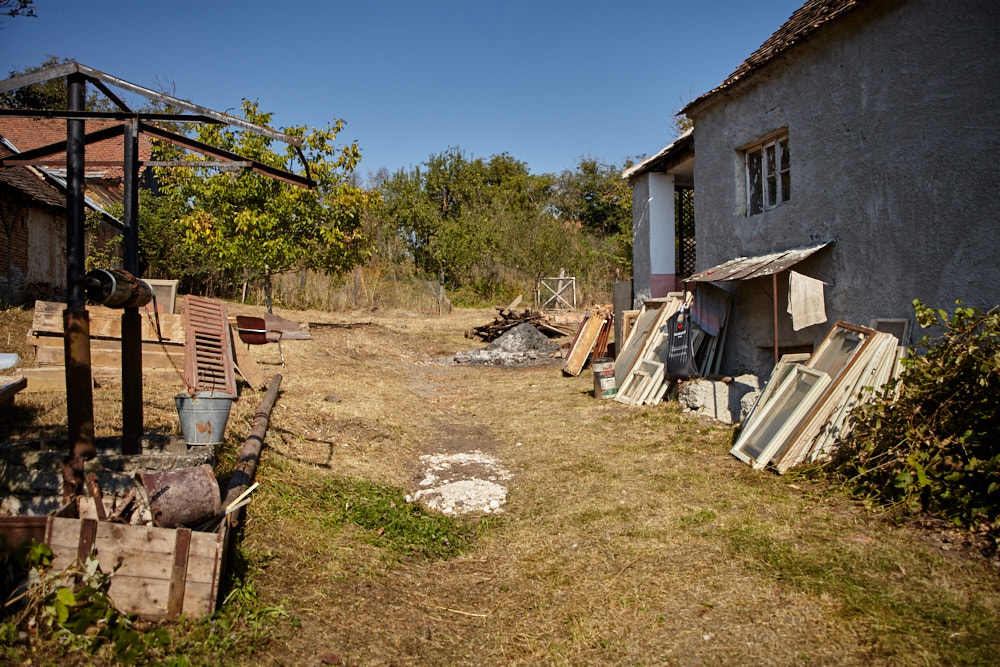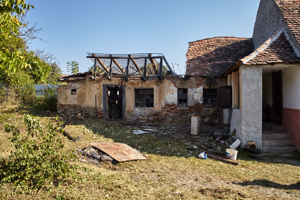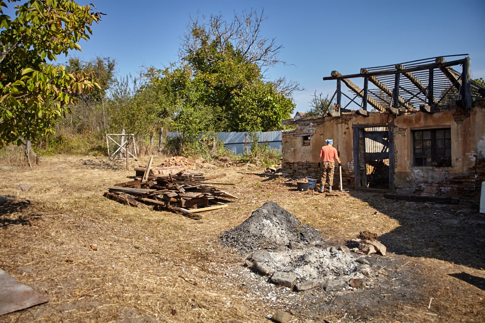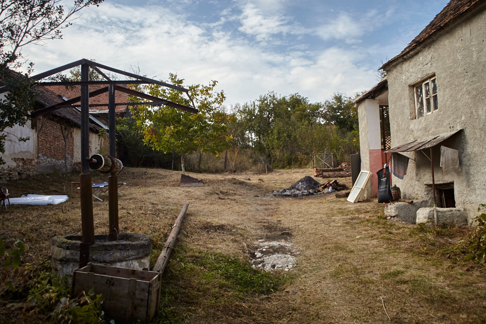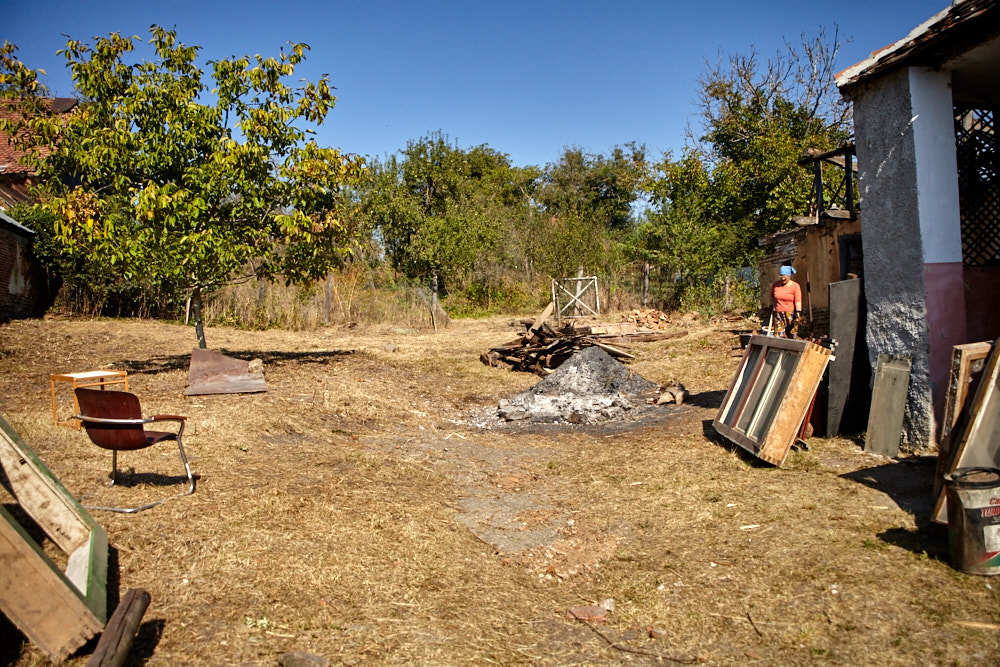 Constantin – so heißt der Papa – kommt mit dem Fahrrad, an das er den Freischenider gebunden hat. Er spricht rumänisch mit ganz vereinzelten deutschen Wörtern. Ich verstehe ihn dennoch gut. Ruck-zuck ist der Freischneider losgebunden, das Geschirr umgelegt und der Motor läuft. Ausgehend von der Einfahrt nach oben rückt er dem Gestrüpp zu Leibe. Wir unterstützen, indem wir das freigelegte Gerümpel aufheben und so Raum für die Maschine schaffen. So etwas wie Sperrmüll gibt es hier nicht, haben wir von Wolfgang schon erfahren. Was entsorgt werden muss, wird verbrannt. Deshalb lege ich, nachdem das Gras gemäht ist, mitten im Hof eine Feuerstelle an und entfache ein kleines Lagerfeuer. Elisabeth übernimmt das Verheizen des modrigen Holzes, was wir aus dem Gestrüpp ziehen. Constantin fähr nochmal weg und kommt kurze Zeit später mit einer Hacke und einem Rechen wieder. Mit dem Rechen nimmt er das Gras auf und wirft es ins Feuer. Es raucht heftig, das stört ihn aber nicht sonderlich. Auch mein Steinkreis um die Feuerstelle bildet keine Grenze für ihn, da Feuer brennt alsbald auch noch weit darum. Wir müssen ein wenig aufpassen, dass nicht der ganze Hof Feuer fängt, denn unter dem frischen Gras gibt es auch jede Menge vertrocknetes.