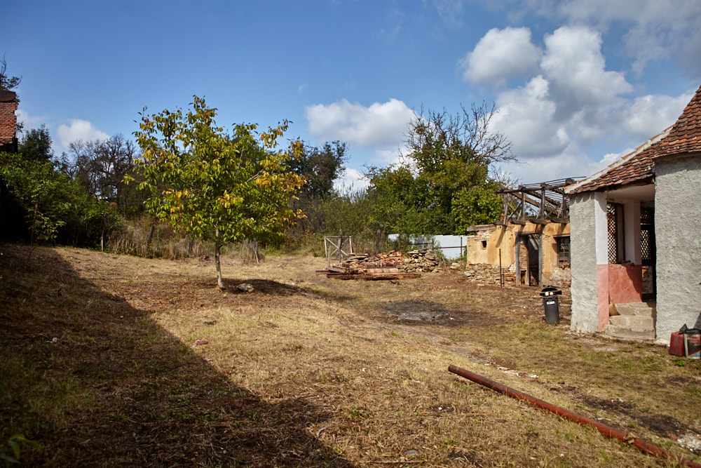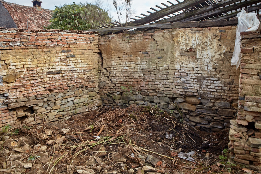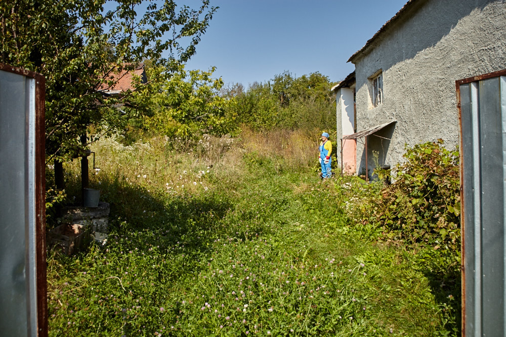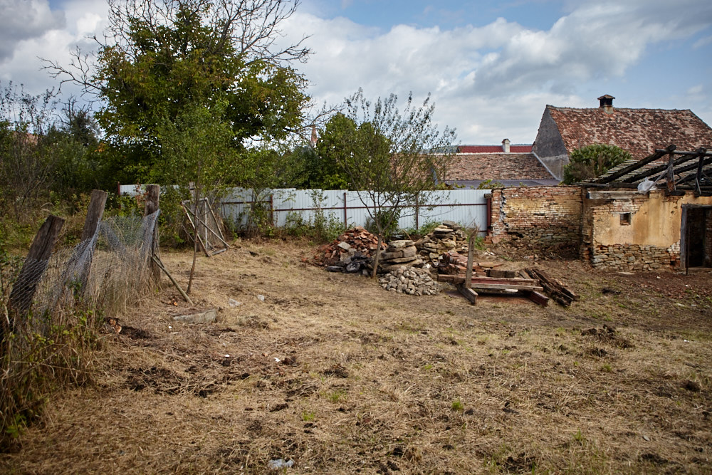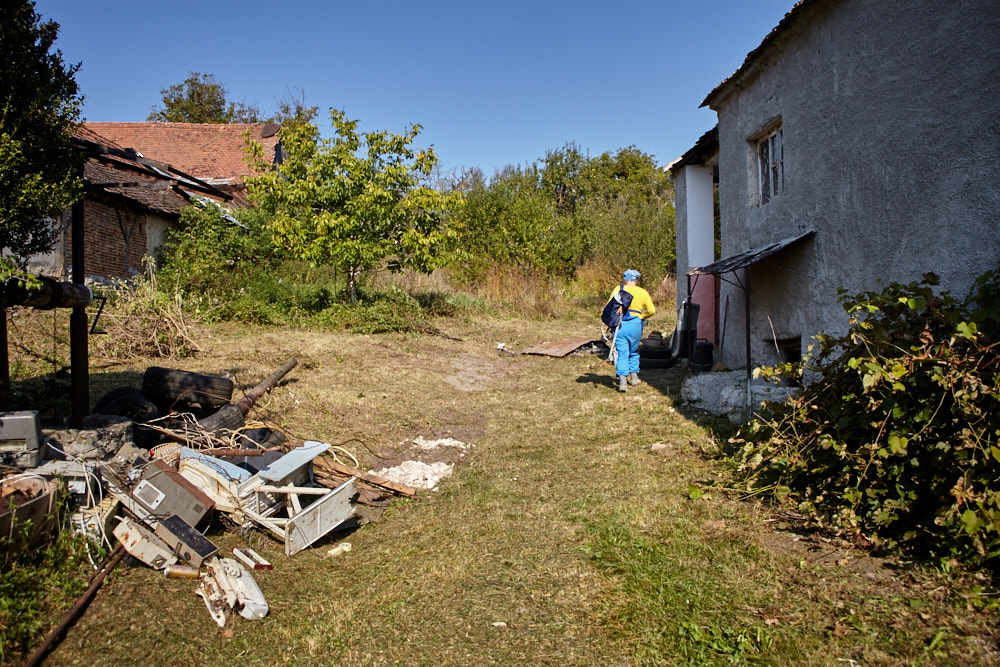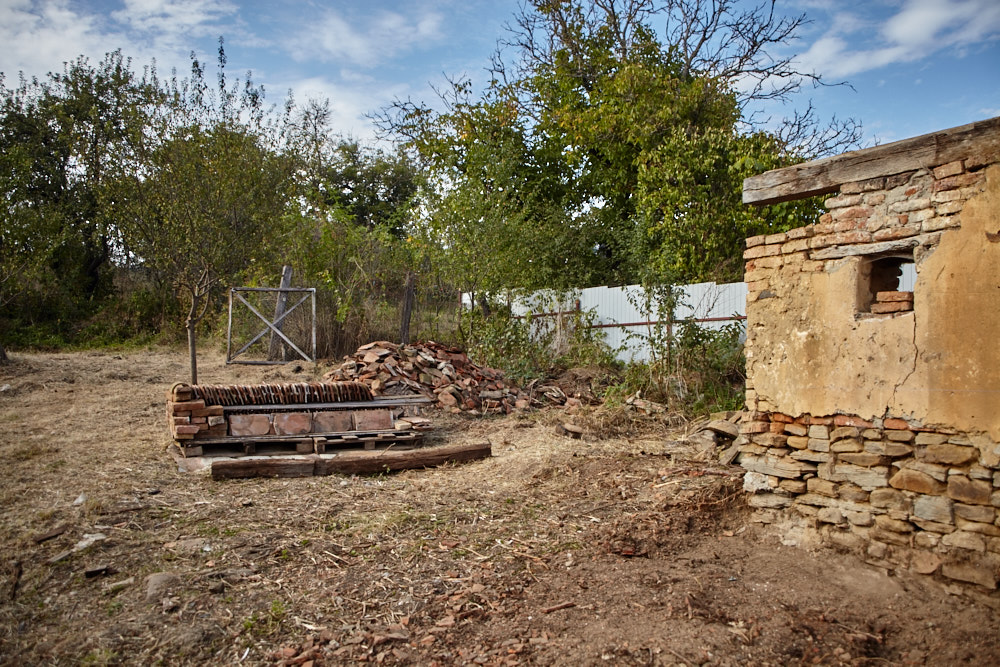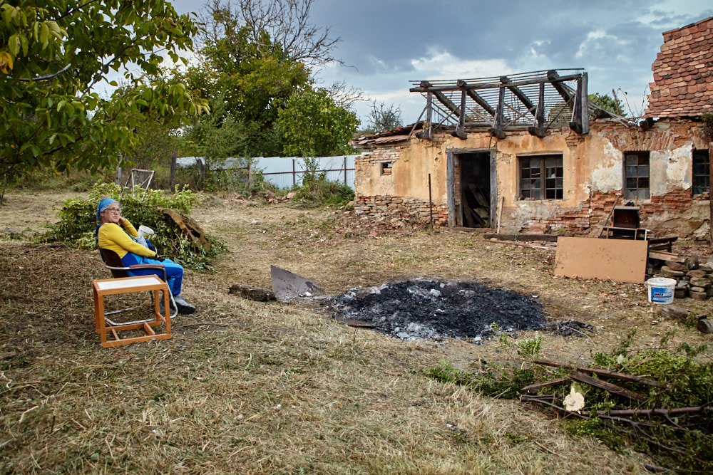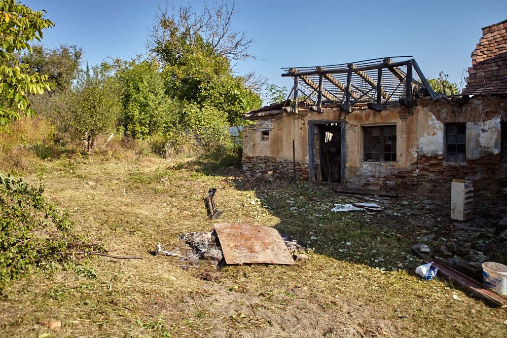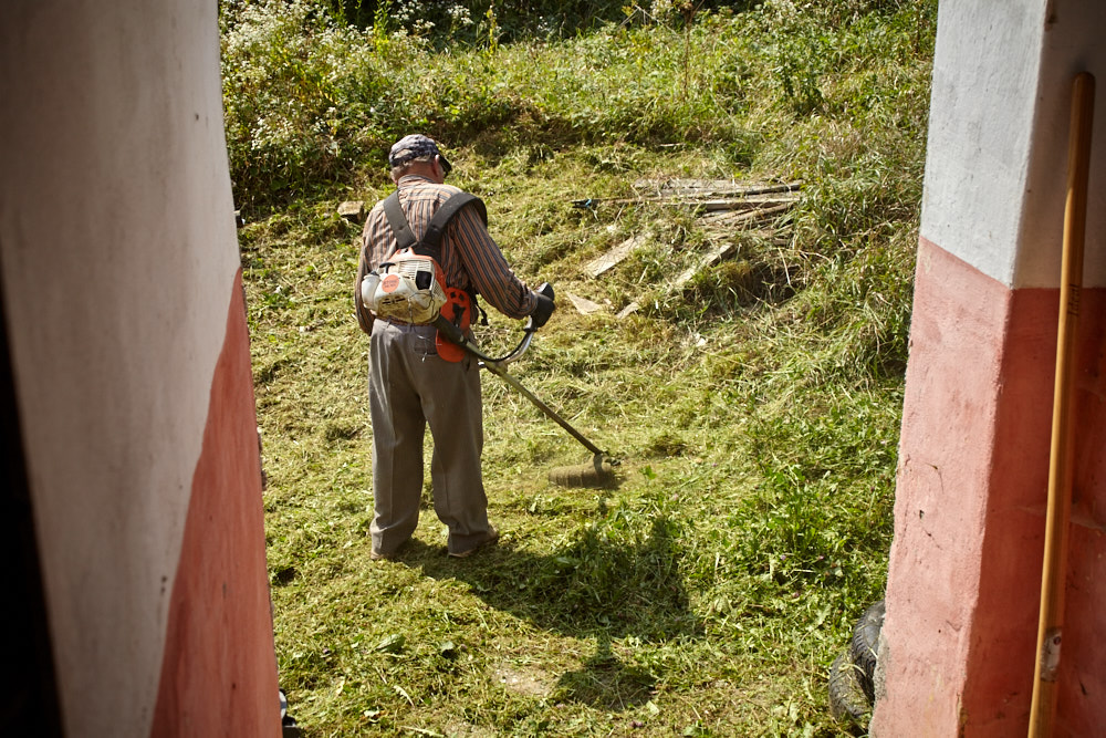 Constantin – so heißt der Papa – kommt mit dem Fahrrad, an das er den Freischenider gebunden hat. Er spricht rumänisch mit ganz vereinzelten deutschen Wörtern. Ich verstehe ihn dennoch gut. Ruck-zuck ist der Freischneider losgebunden, das Geschirr umgelegt und der Motor läuft. Ausgehend von der Einfahrt nach oben rückt er dem Gestrüpp zu Leibe. Wir unterstützen, indem wir das freigelegte Gerümpel aufheben und so Raum für die Maschine schaffen. So etwas wie Sperrmüll gibt es hier nicht, haben wir von Wolfgang schon erfahren. Was entsorgt werden muss, wird verbrannt. Deshalb lege ich, nachdem das Gras gemäht ist, mitten im Hof eine Feuerstelle an und entfache ein kleines Lagerfeuer. Elisabeth übernimmt das Verheizen des modrigen Holzes, was wir aus dem Gestrüpp ziehen. Constantin fähr nochmal weg und kommt kurze Zeit später mit einer Hacke und einem Rechen wieder. Mit dem Rechen nimmt er das Gras auf und wirft es ins Feuer. Es raucht heftig, das stört ihn aber nicht sonderlich. Auch mein Steinkreis um die Feuerstelle bildet keine Grenze für ihn, da Feuer brennt alsbald auch noch weit darum. Wir müssen ein wenig aufpassen, dass nicht der ganze Hof Feuer fängt, denn unter dem frischen Gras gibt es auch jede Menge vertrocknetes.