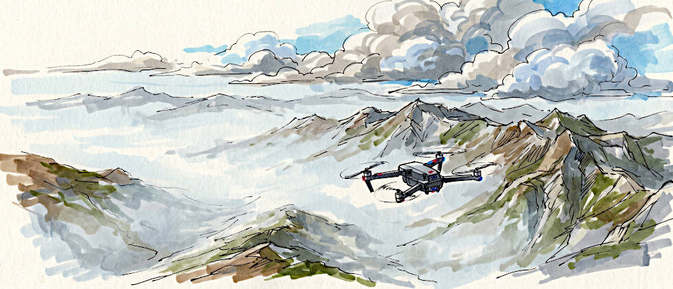 Wir reiten weiter – diesmal nicht in den Sonnenuntergang, sondern im rechten Winkel dazu. Es geht bergab über einen Weg, der aud mind. 10 – teils grasbewachsenen – Spurrillen besteht. Ein paar Gesichter wirken ein wenig angesterngt. Hier gibt es auch wieder den ein oder anderen Strich für die Challenge. Während wir Mopped aufheben, ist uns der Jürgen abhanden gekommen. Den fangen wir wieder ein, nachdem wir eine Steilabfahrt genommen haben. Noch ein Hügel, eine Senke, dann geht es hoch zu den drei Kreuzen – ein weiterer Checkpoint und ein Platz, mit einem tollen Blick über Brebu Nou und Teile des Semenic. Nach der Pause eine weitere Anweisung: Wir trialen die Abfahrt bis runter zum See ohne Motor. Ich möchte die Gruppe dafür begeistern, sich annähernd lautlos durchs Gelände zu bewegen. Ganz abgesehen davon macht es die Koordination einfacher, wenn man Gas und Kupplung mal außen vor lassen und sich nur auf Gleichgewicht und Bremsen konzentrieren kann.